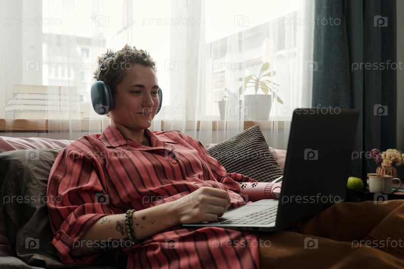 Молодая женщина использует ноутбук и наушники, сидя на кровати