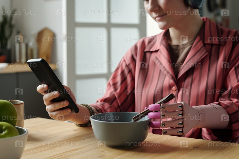 Молодая взрослая женщина с протезированной рукой использует смартфон во время еды