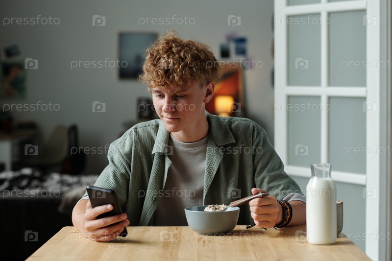 Подросток использует смартфон во время завтрака за домашним столом