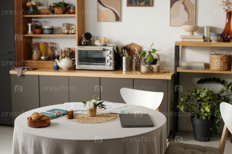 Кухонный стол с ноутбуком, книгами и свежими пирожными в дневное время