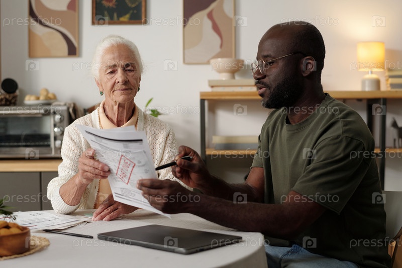 Черный мужчина объясняет документы старшей женщине в помещении