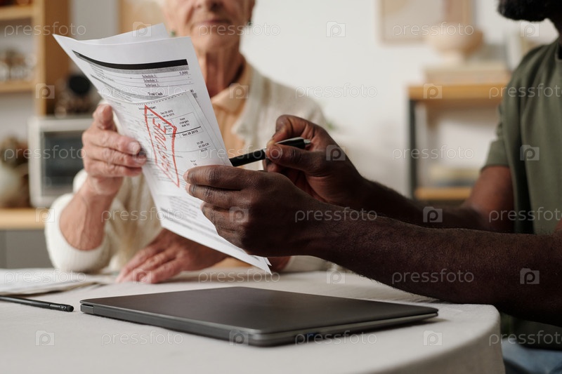 Женщина среднего возраста и молодой взрослый чернокожий мужчина просматривают финансовые документы