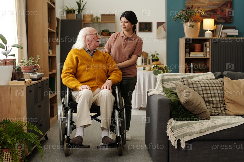 Молодая латиноамериканская женщина помогает старшему мужчине, сидящему в инвалидном кресле