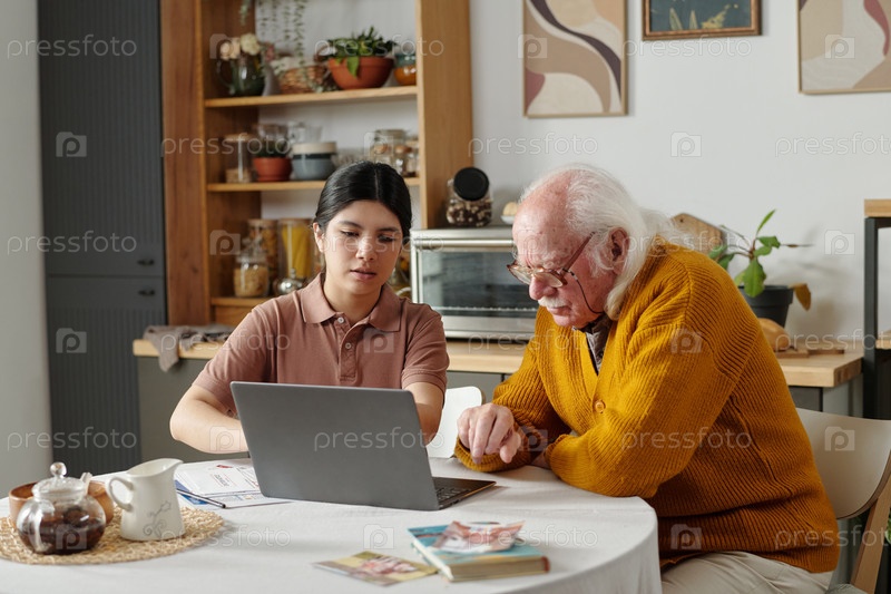 Молодая взрослая испаноязычная женщина помогает старшему человеку с помощью ноутбука