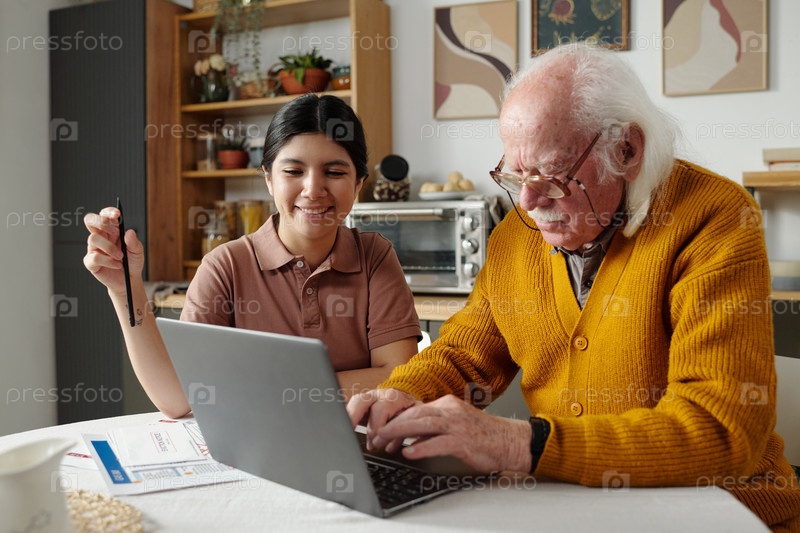 Старший мужчина использует ноутбук с молодой взрослой испаноязычной женщиной, помогающей