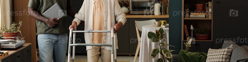 Старшая женщина ходит с Уолкером при поддержке чернокожего мужчины, держащего планшет