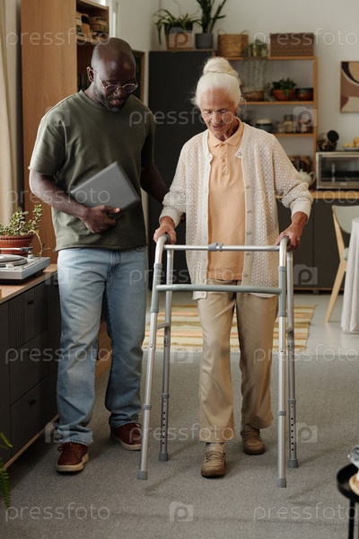 Молодой чернокожий мужчина помогает старшей женщине, используя ходунка в помещении