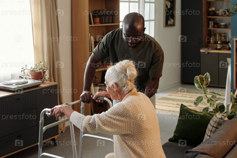 Черный мужчина поощряет старшую женщину ходить с Уолкером