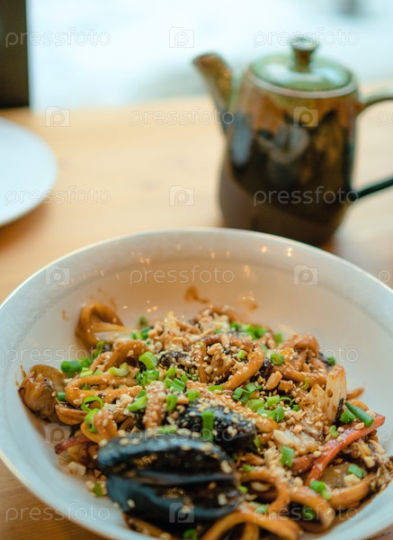 Интерьер общественного ресторана предлагает расслабляющую атмосферу, чтобы насладиться питательной и вкусной едой с ароматными ингредиентами