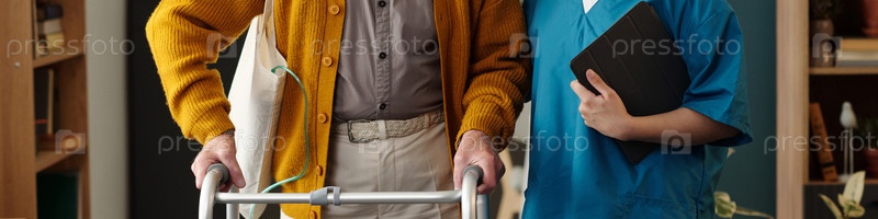 Мужчина-старший, использующий ходунка, стоящий рядом с медсестрой молодых взрослых в помещении