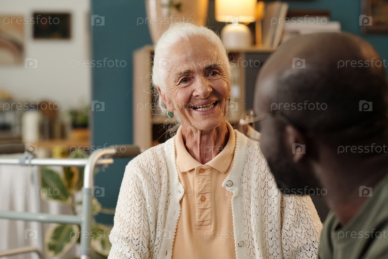 Старшая женщина улыбается, разговаривая с чернокожим мужчиной