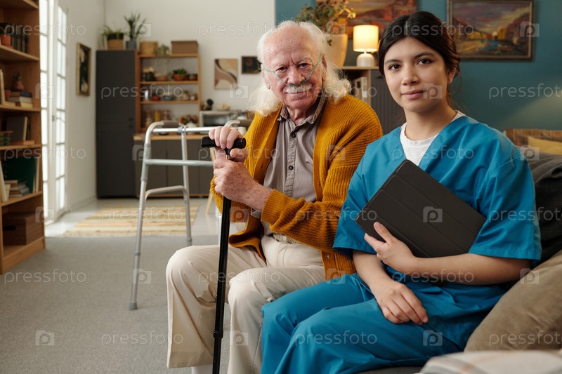 Портрет старшего мужчины, сидящего с тростью рядом с юной взрослой женщиной, улыбающейся