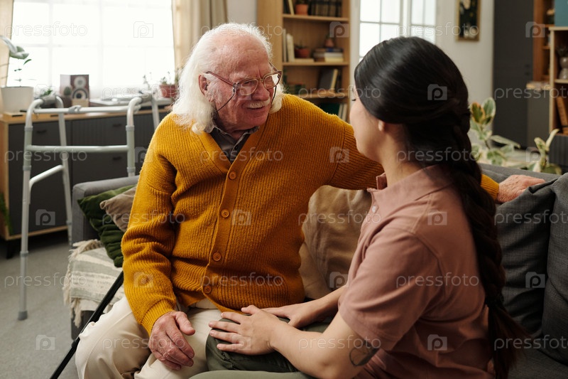Старший мужчина улыбается, разговаривая с молодой взрослой латиноамериканкой