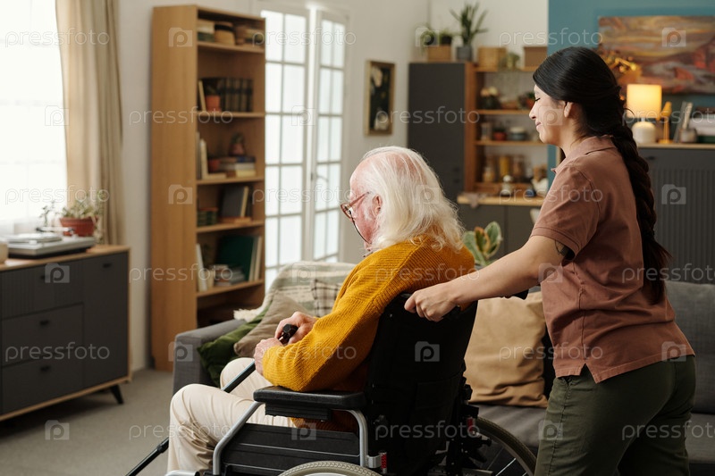 Молодая взрослая испаноязычная женщина помогает пожилому человеку с инвалидностью