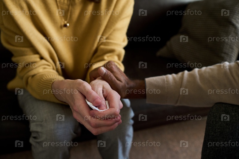 Женщина среднего возраста держит ткань, утешенная старшим чернокожим мужчиной