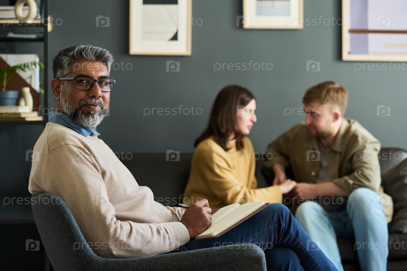 Портрет южноазиатского мужчины среднего возраста, консультирующего молодую пару