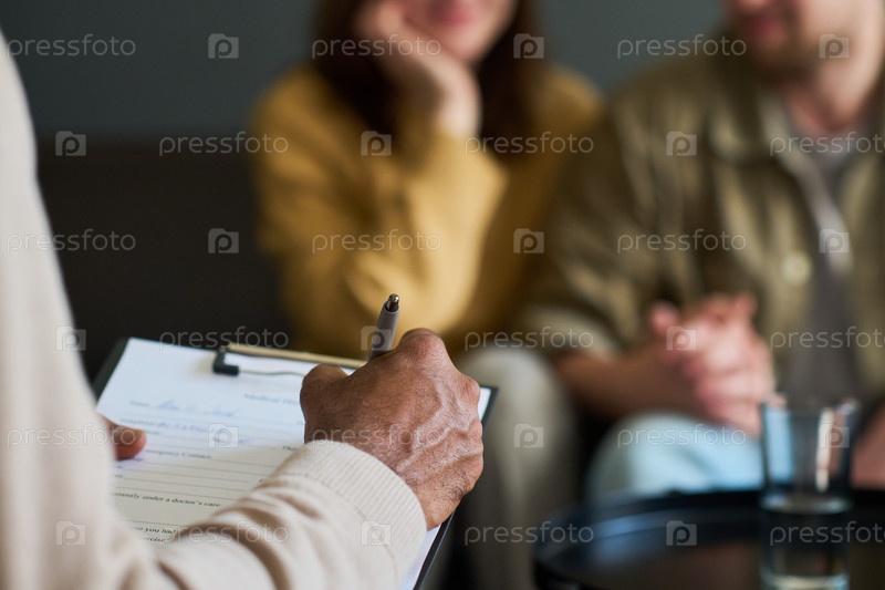 Чернокожий мужчина среднего возраста консультирует молодую пару во время сеанса терапии