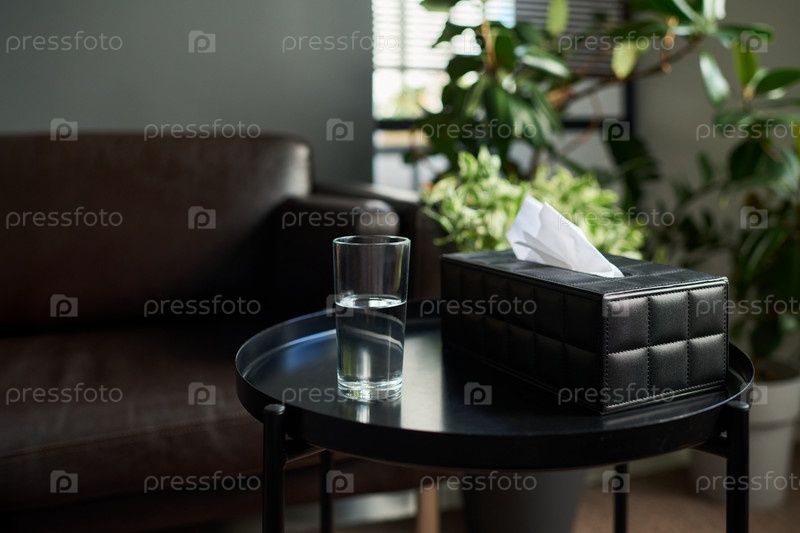 Стакан воды и коробка с тканями сидят за столом в современной гостиной