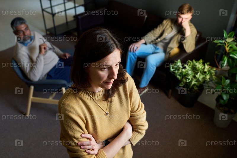 Молодая женщина стоит задумываясь, в то время как два мужчины сидят на заднем плане