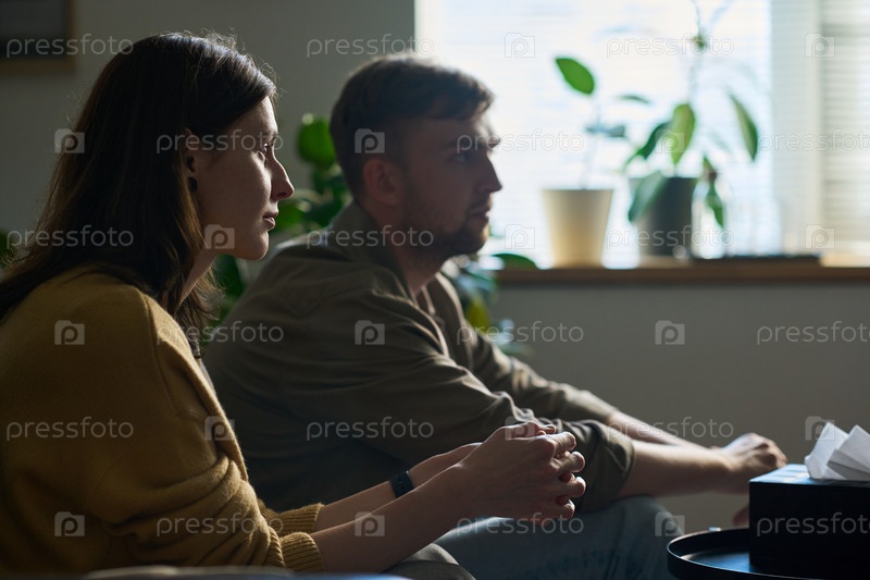 Молодая взрослая пара, сидящая вместе и посещающая консультационную сессию