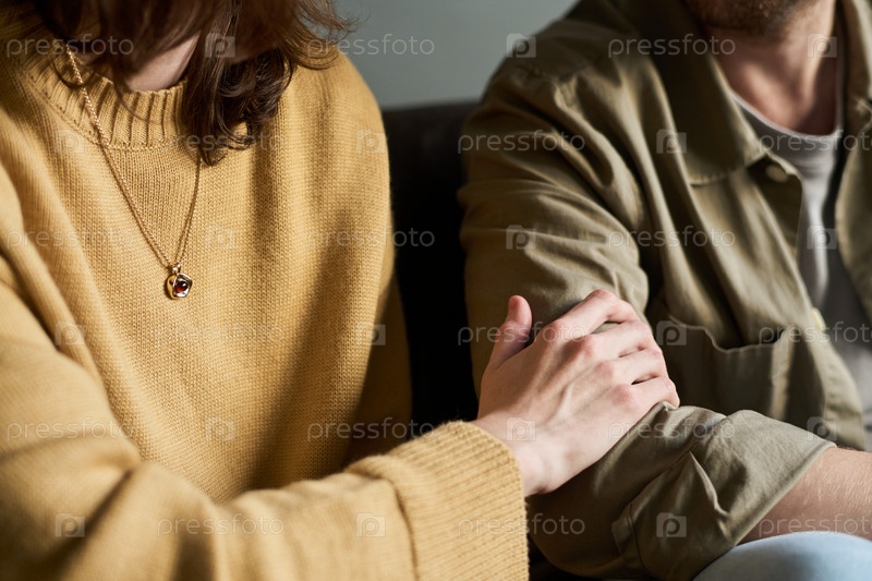 Молодая женщина утешает молодого человека, прикасаясь к руке