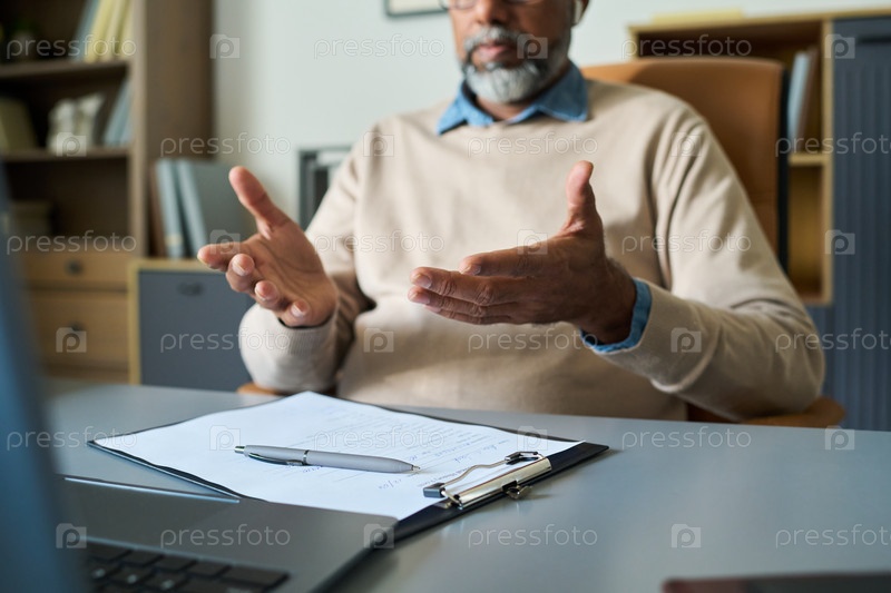 Мужчина среднего возраста с бирациальным лицом жестикулирует, объясняя во время онлайн-встречи