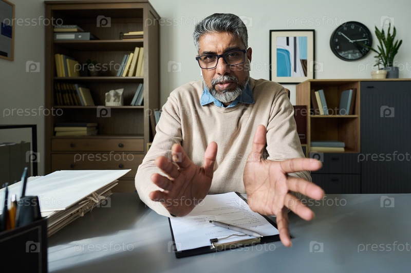 Портрет южноазиатского мужчины среднего возраста, объясняющего во время деловой встречи
