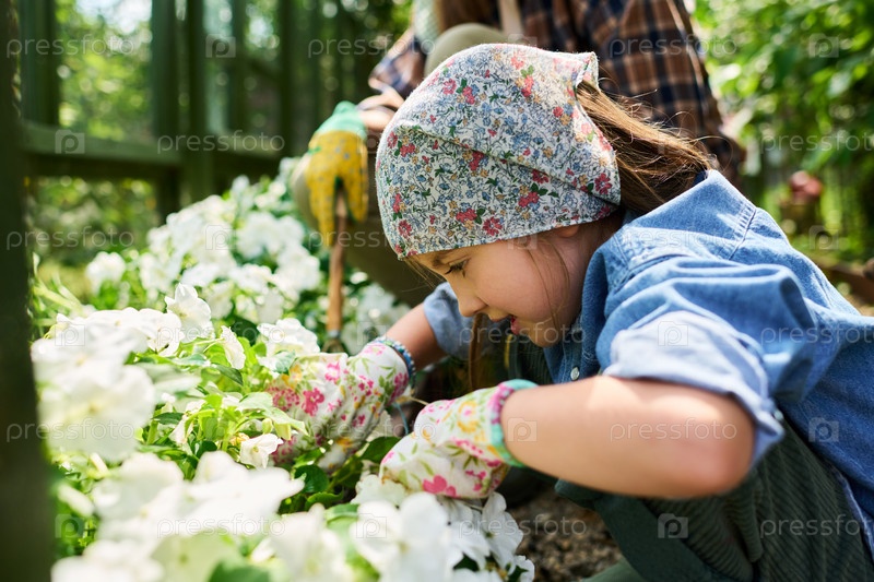 Девушка садится с взрослой женщиной в цветочном клумбе во время солнечного дня