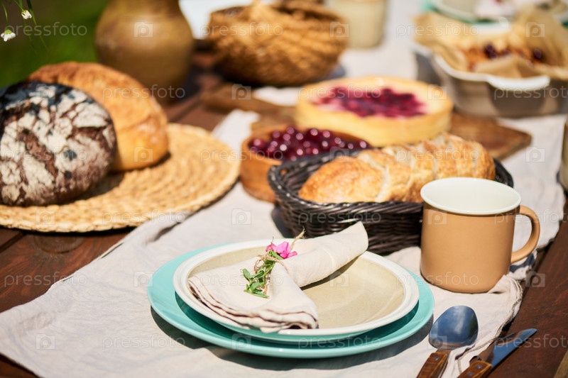 Настроение стола на открытом воздухе с свежим хлебом и выпечкой во время сбора