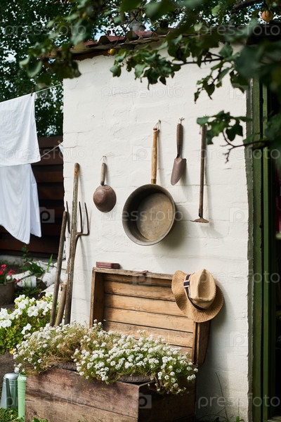 Рустические садовые инструменты, висящие на стене рядом с деревянным ящиком с цветущими цветами