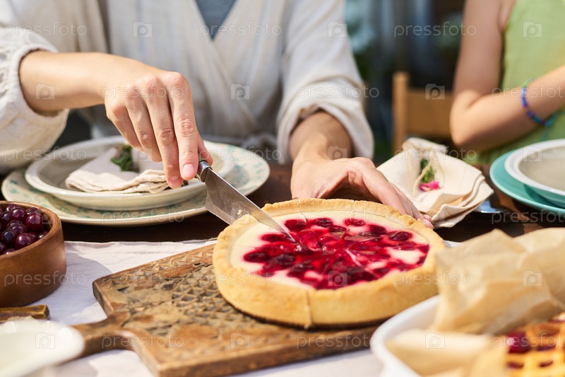 Молодая взрослая женщина нарезает вишневый чизкейк во время встречи на открытом воздухе