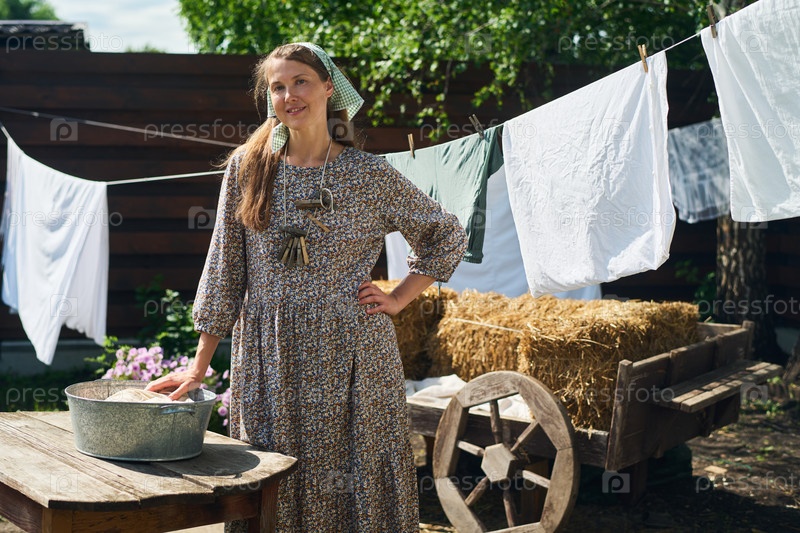 Портрет женщины среднего возраста, стоящей на открытом воздухе возле стиральной линии