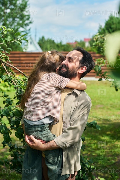 Мужчина среднего возраста обнимает молодую девушку на открытом воздухе улыбаясь