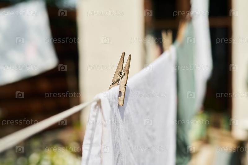 Ближайшее изображение деревянной одежды Спин держащий стирку сушки белья на улице на Clothesline