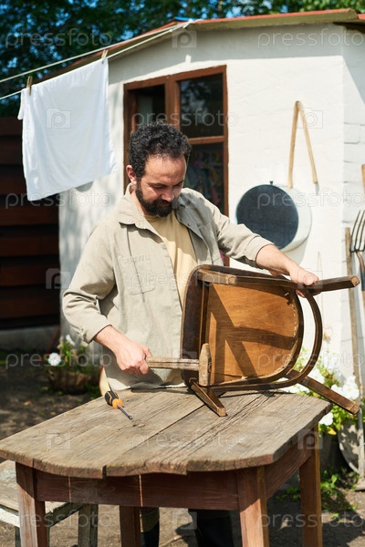 Мужчина средних лет ремонтирует деревянный стул на открытом воздухе в заднем дворе