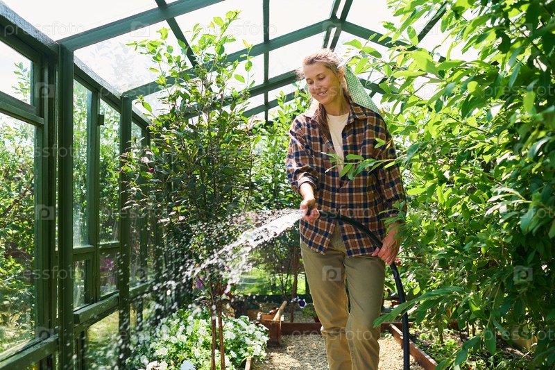 Молодая взрослая женщина поливает растения внутри тепличного сада