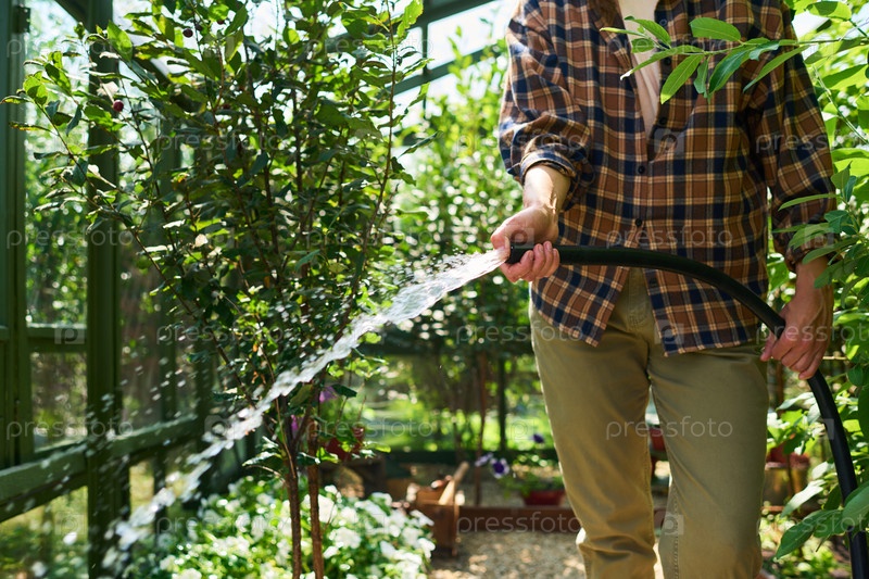 Молодой взрослый мужчина поливные растения в тепличном саду