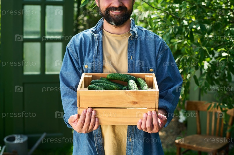 Мужчина средних лет держит деревянный ящик, наполненный свежими огурцами