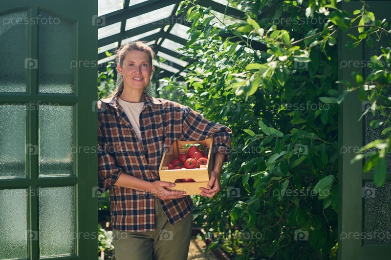 Молодая взрослая женщина собирает помидоры в тепличном саду