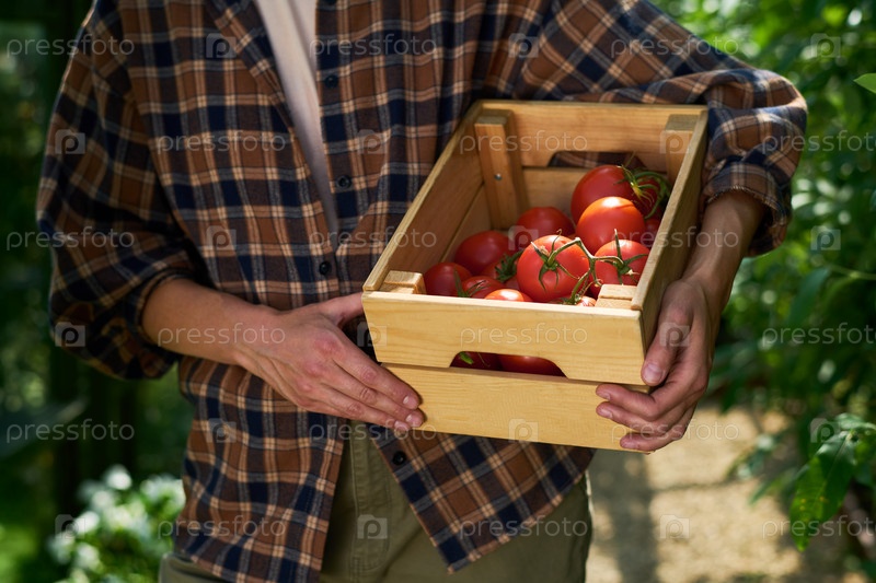 Мужчина средних лет держит деревянный ящик, наполненный свежими помидорами