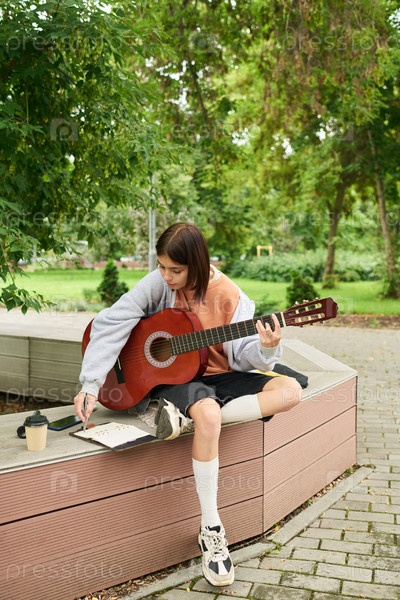Девушка-подросток играет на гитаре и пишет музыку в парке