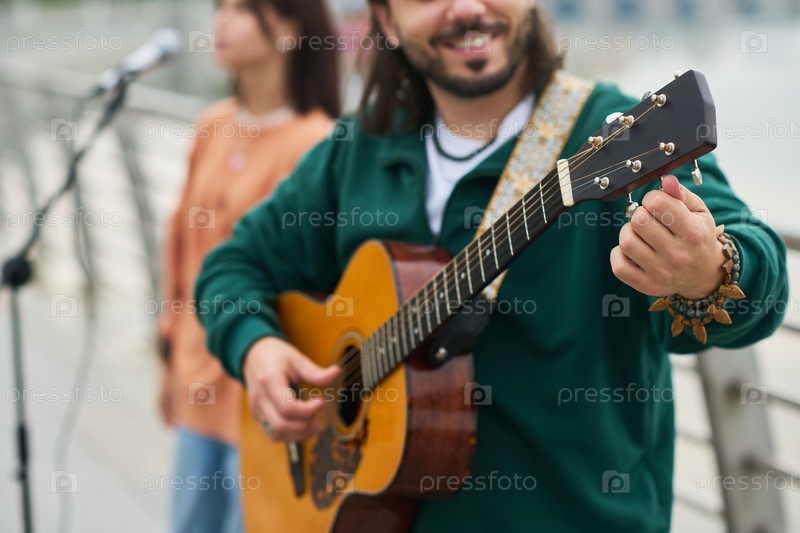 Молодой человек играет на акустической гитаре на открытом воздухе с певицей