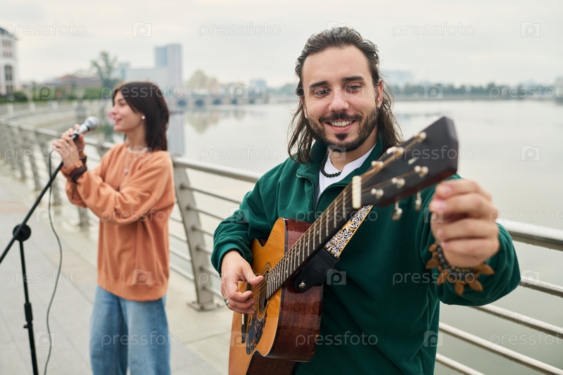 Молодой человек играет на гитаре, в то время как молодая женщина поёт на свежем воздухе