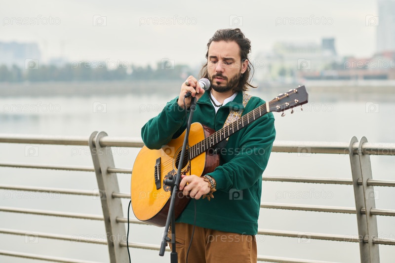 Молодой взрослый мужчина поет и играет на гитаре На открытом воздухе возле набережной