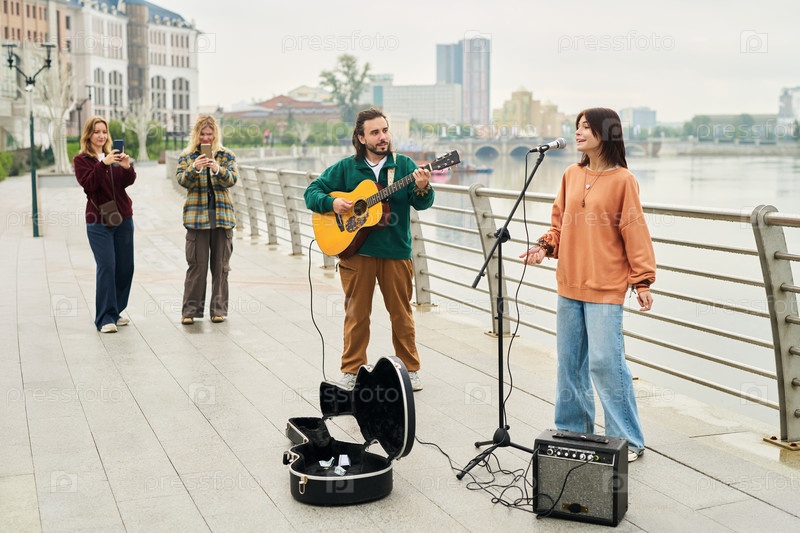 Молодой человек играет на гитаре и молодая женщина поёт на свежем воздухе