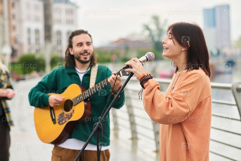 Молодая женщина поёт, пока молодой человек играет на гитаре в открытом воздухе
