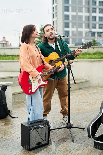 Молодая женщина и молодой мужчина исполняют живую музыку на открытом воздухе