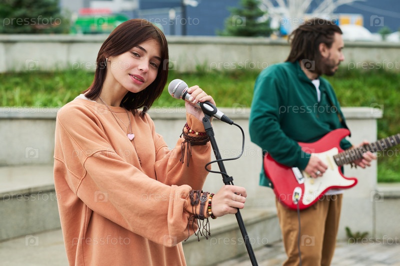 Портрет молодой женщины, поющей на свежем воздухе с гитаристом