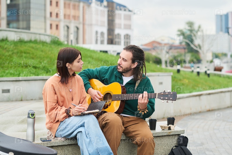Молодая женщина слушает молодого человека, играющего на гитаре на улице