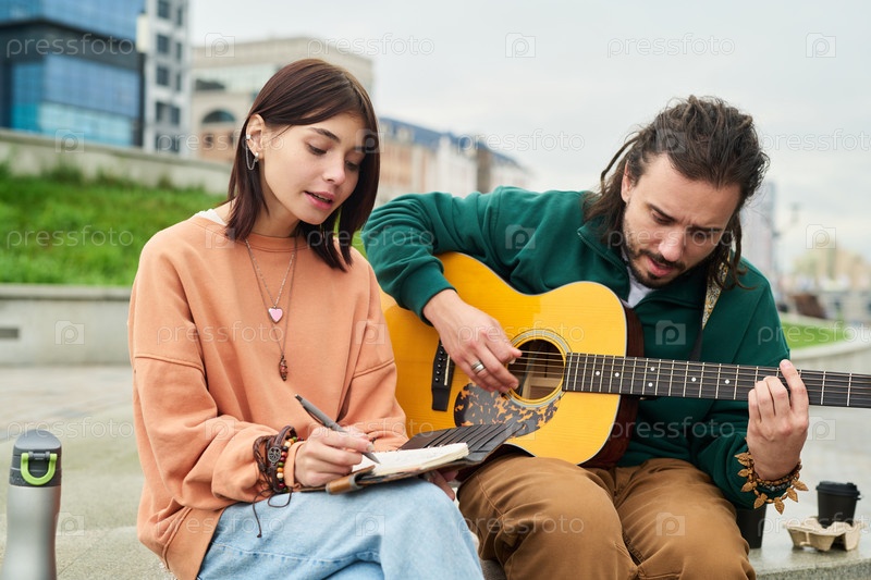 Молодая женщина пишет лирику, в то время как молодой человек играет на гитаре